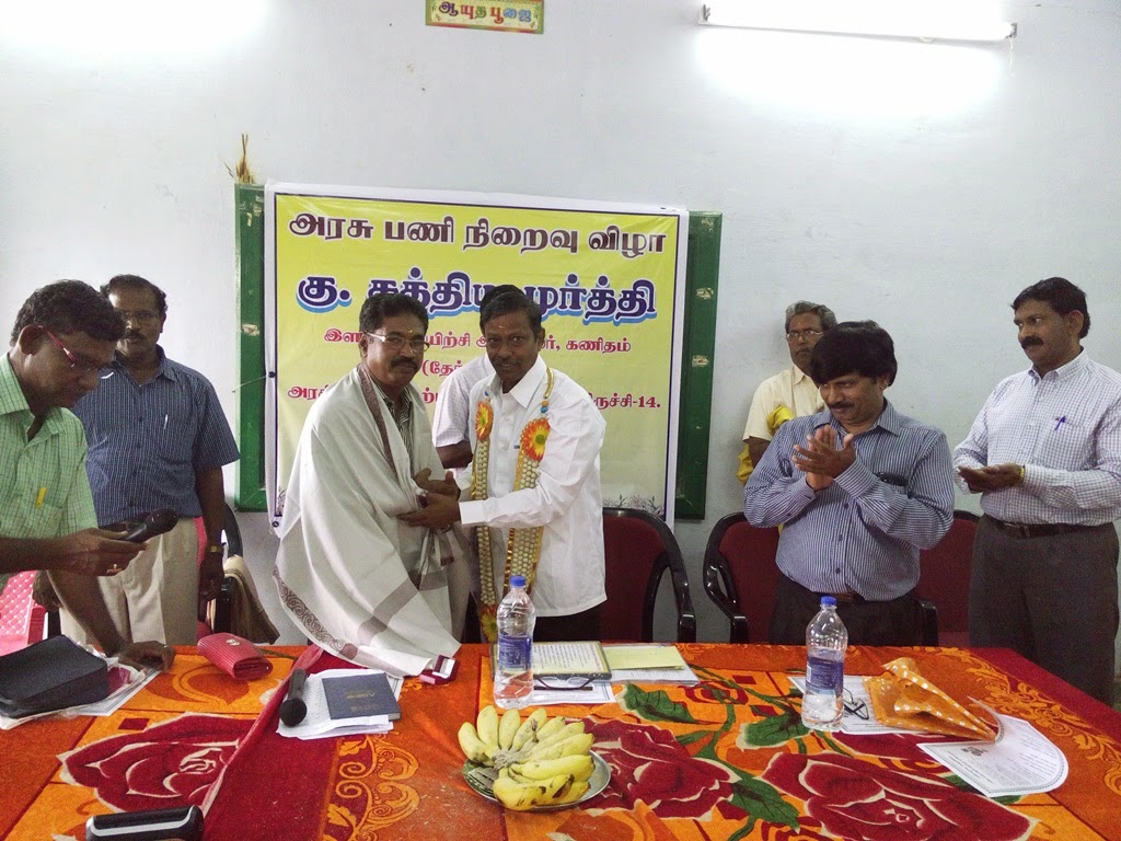 திரு கு.சத்தியமூர்த்தி (தேர்வு நிலை) அவர்களின் அரசு பணி நிறைவு விழா 28-04-2015 அன்று திருச்சி அரசினர் தொழிற்பயிற்சி நிலைய வளாகத்தில் திருச்சி மண்டல இணை இயக்குநர் அவர்கள் முன்னிலையில் திருச்சி அரசினர் தொழிற்பயிற்சி நிலைய துணை இயக்குனர் /முதல்வர் அவர்கள் தலைமையில் அலுவலர்கள் ஆசிரியர்களின் துணையோடு மிகவும் சிறப்பாக நடைபெற்றது .